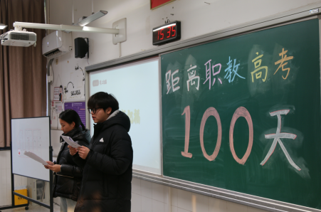 为激发“3+4”高三学子冲刺斗志,决胜职教高考,经济贸易学院为52310班举行了职教高考百日誓师大会。经济贸易学院杨帆院长、朱绿尘副院长和“3+4”高三任课教师参与本次活动,高二年级全体同学到场观摩助威。