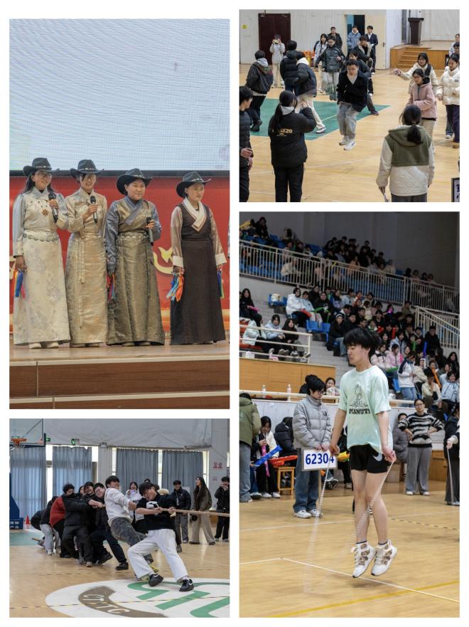 活动伊始,两首充满青春活力的歌曲轮番上演,欢快的旋律瞬间感染了全场气氛,为这场冬日盛会拉开了精彩序幕。随后,学生项目单摇跳绳、一带一双人跳、8 字跳长绳及拔河四大项目依次进行,从单人到双人,再到班集体,再到年级集体,既考验选手的体能与技巧,也注重团队的默契配合。