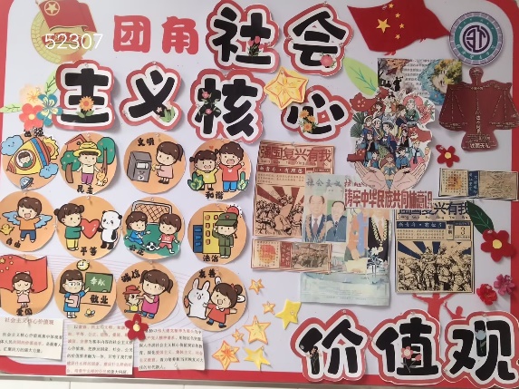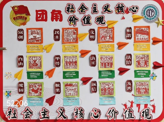 走进教室,主题鲜明、设计新颖的团角格外引人注目。有的班级以图文并茂的形式展现核心词内涵,有的班级以鲜活案例传递正能量,充分展现了同学们对核心价值观的深刻理解与创新表达。52206班以剪纸艺术为载体,将社会主义核心价值观二十四个字对应的场景生动呈现,用传统技艺诠释时代精神。52307班与52403班则精选《人民日报》等权威媒体的相关报道,深入理解核心价值观的内涵与时代意义。