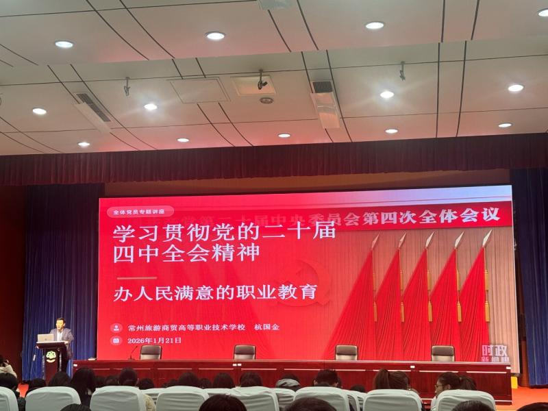 2026年1月21日下午,我校在季子楼季子厅召开全体党员大会,校党委副书记陈晓霞主持会议,由校党委书记杭国金给全体党员讲授党课。